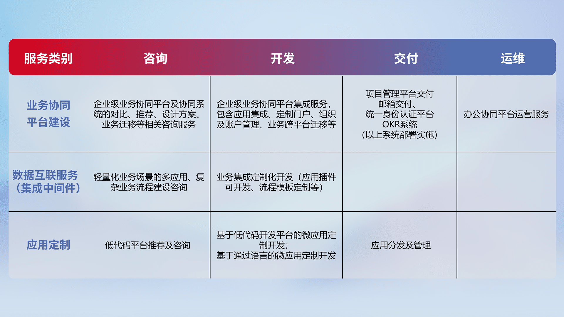 针对钉钉、、、、企微、、、IDaas等平台级产品提供产品的规划、、、方案、、交付、、、、定制化开发等服务,,实现如统一协同办公、、智能客户服务、、混合会议管理、、、智能数据查询、、等业务场景,,,,实现数字化转型。。。。