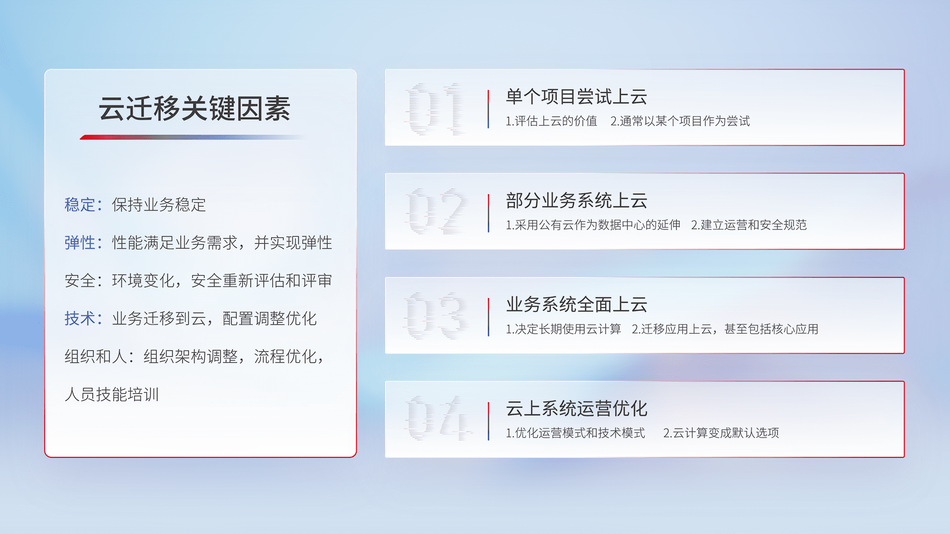 结合实际业务,,,,从规划设计、、、云平台选型、、、、云原生改造、、、数据迁移、、、、集成交付,,,迁移全过程为客户识别最佳上云路径,,做好风险识别管理,,,设计网络架构、、、、身份权限、、安全审计合规、、、操作审计、、日志审计、、监控告警策略、、、、多站点容灾设计等,,,对云上基础设施进行整体规划,,,,提升IT治理水平,,以满足弹性、、、高可用、、、、高性能的需求。。