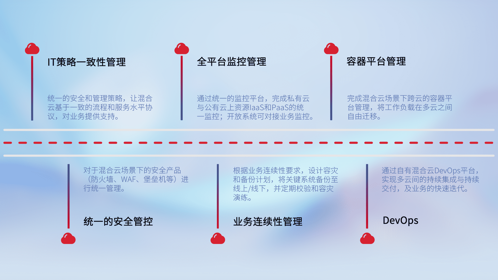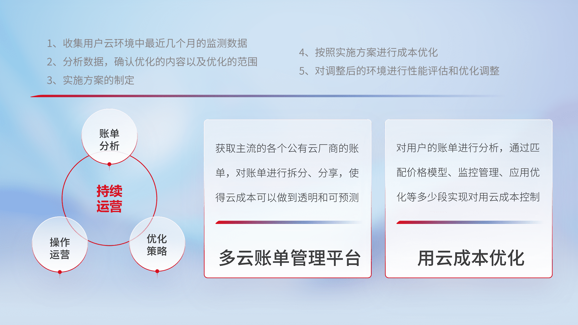 通过多云纳管,,,以统一的资源数据模型把客户的云资源进行抽象和封装,,,,进而实现对多云资源的统一操作,,保障云资源管理的可靠性、、稳定性与可用性。。。量身定制化运维内容,,,配置、、、、开发运维、、、补丁管理、、、备份、、监控、、认证和访问管理、、、、审计和日常巡检等,,保障在用云过程中的可靠度,,,,稳定度以及高可用率。。。。